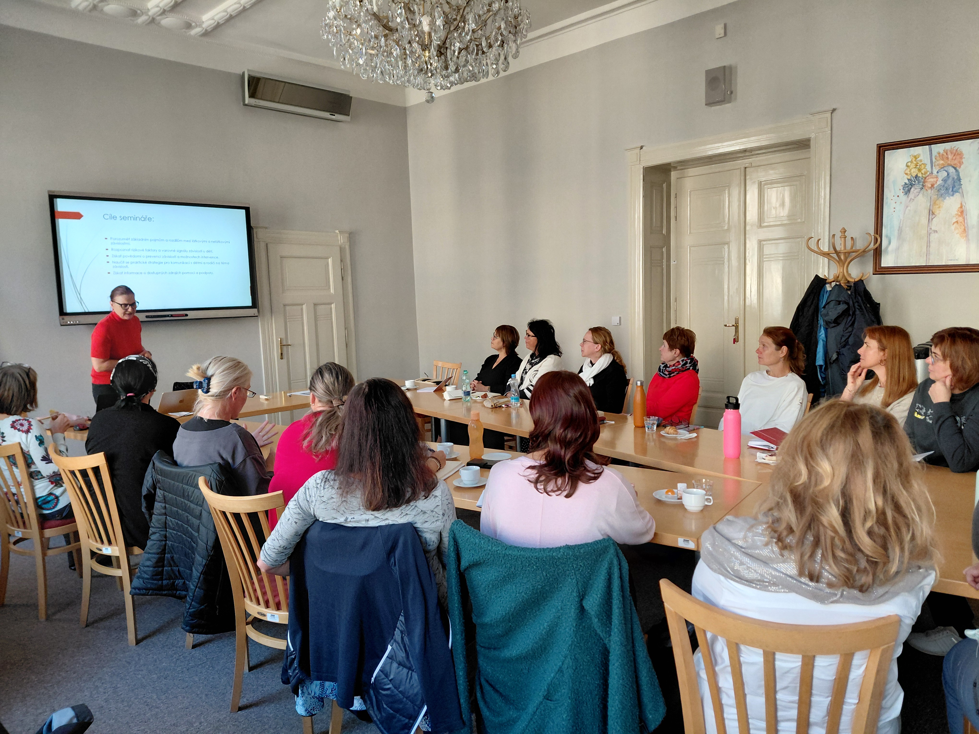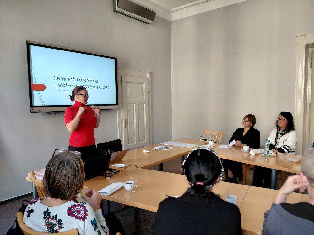 Společně s účastníky jsme se zabývali problematikou těchto závislostí. Lektorka Mgr. Pavla Kubíčková, MBA přítomné seznámila s typy látek, které nejčastěji způsobují závislost, a k nimž patří například alkohol, drogy a tabák, ale také s nelátkovými závislostmi, jako je třeba závislost na digitálních technologiích, hrách či sociálních médiích. Jejím cílem bylo, aby přítomní pedagogové byli po absolvování semináře schopni porozumět rozdílům mezi těmito závislostmi, rozpoznat rizikové faktory a varovné signály závislostí u dětí, získali povědomí o prevenci závislostí a možnostech intervence, naučili se praktické strategie pro komunikaci s dětmi a rodiči na téma závislostí a měli k dispozici dostatek informací o dostupných zdrojích pomoci a podpory.