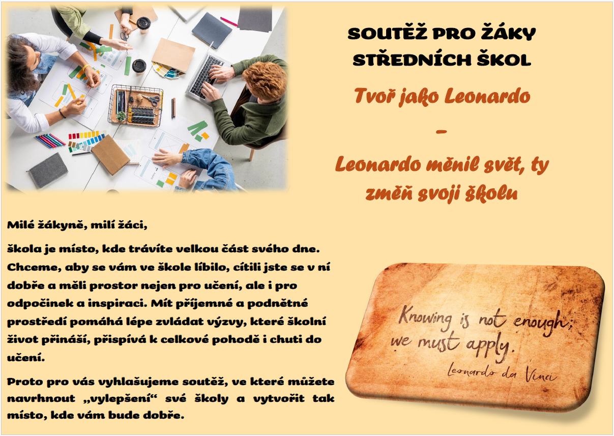 Ta nese název „Tvoř jako Leonardo – Leonardo měnil svět, ty změň svoji školu“ a je určena pro žáky středních škol. Jejím smyslem je navrhnout a popsat konkrétní zlepšení školního prostředí, které přispěje k tomu, abyste se ve škole cítili lépe, rádi do ní chodili a vnímali ji jako milé, inspirativní a přátelské místo. A proč? Protože škola je místem, kde trávíte velkou část svého času. Proto je důležité, aby se vám ve škole líbilo, cítili jste se tam dobře a aby vás školní prostředí podporovalo v osobním růstu a vzdělávání. Každý z vás může přispět k tomu, aby byla škola místem, kde se nejen učíte, ale i odpočíváte, inspirujete se a vytváříte pozitivní atmosféru. Mít příjemné a podnětné prostředí nám všem totiž pomáhá lépe zvládat výzvy, které život přináší.