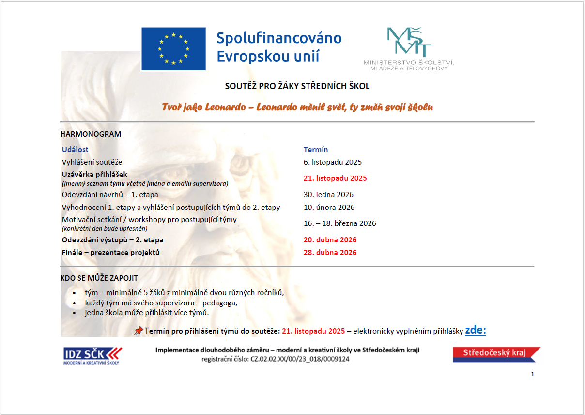 Pojďte se tedy přihlásit a užít si s námi soutěž plnou společného vymýšlení, tvoření a vylepšování. Odevzdat své přihlášky můžete nejpozději do 21. listopadu 2025 a pro přihlášení, prosím, využijte odpovědní formulář na tomto odkazu: Přihláška Tvoř jako Leonardo.