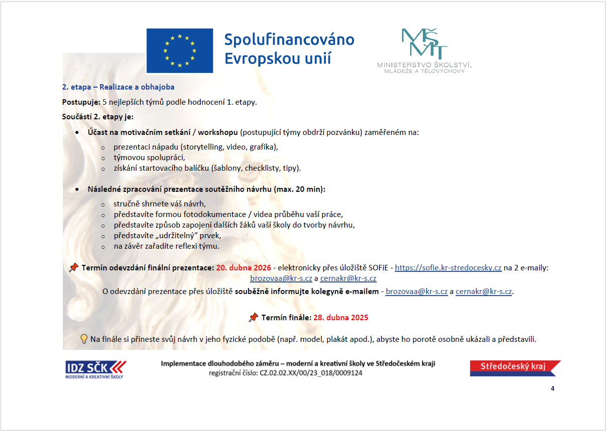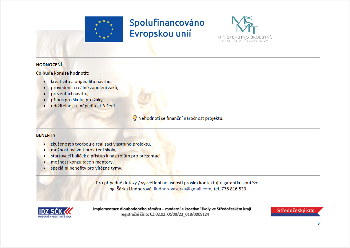 Součástí finále bude osobní prezentace a obhajoba vašeho námětu. Odborná komise se při svém hodnocení zaměří především na kreativitu a originalitu návrhu, provedení a reálné zapojení žáků, ale také na vaši prezentaci, přínos návrhu pro školu a žáky, a v neposlední řadě i na udržitelnost a nápaditost vašeho řešení.