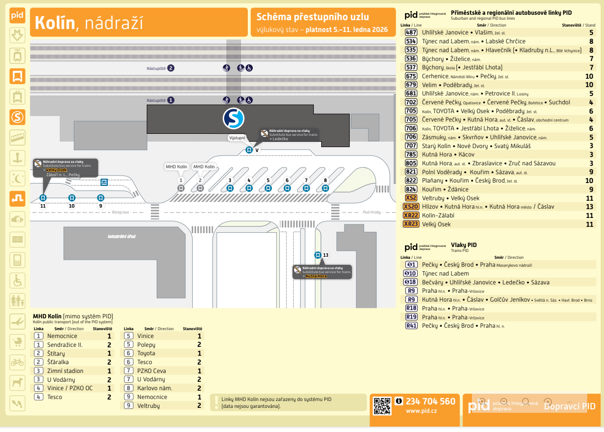 - V termínu 5.1.2026 – 11.1.2026 bude zcela zastaven železniční provoz v úseku Velký Osek - Kolín. Přepravu na tomto úseku zajistí linky náhradní autobusové dopravy: