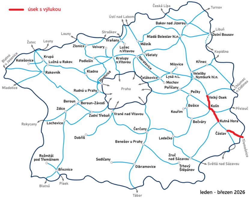 V období 5. – 11. ledna bude výluka v úseku Velký Osek – Kolín.